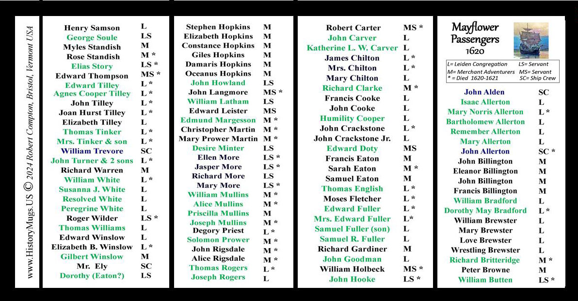 The All of the Mayflower Passengers History Mug lists all of the people who traveled to the New World aboard the Mayflower. The codes next to their names indicate whether they were a member of the Leiden Congregation L, a servant of the Leiden Congregants LS, a Merchant Adventurer M, a Merchant Adventurer servant MS, or a member of the ship’s crew SC. An asterisk * indicates that they passed away during the first winter of 1620-1621.