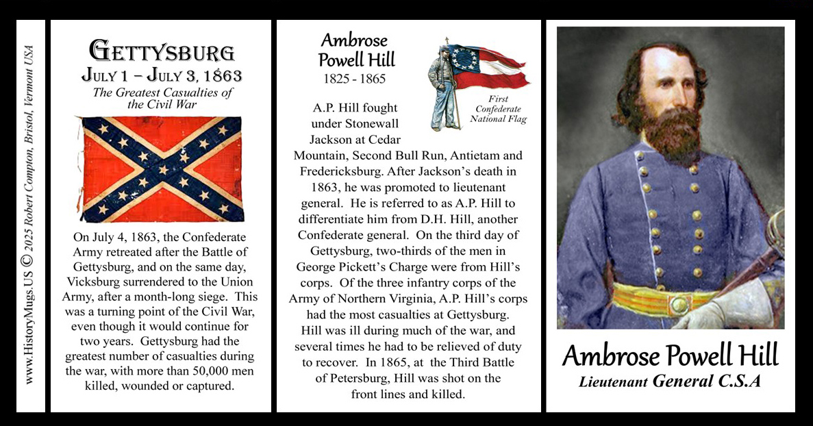 This Ambrose Powell Hill mug is part of our Civil War series profiling participants in the War Between the States. Thousands of Confederate and Union soldiers fought in battles such as Bull Run, Antietam, Fredericksburg, Chancellorsville, Gettysburg, Vicksburg, Chattanooga, Cold Harbor and Petersburg. We honor their sacrifices by telling their stories.