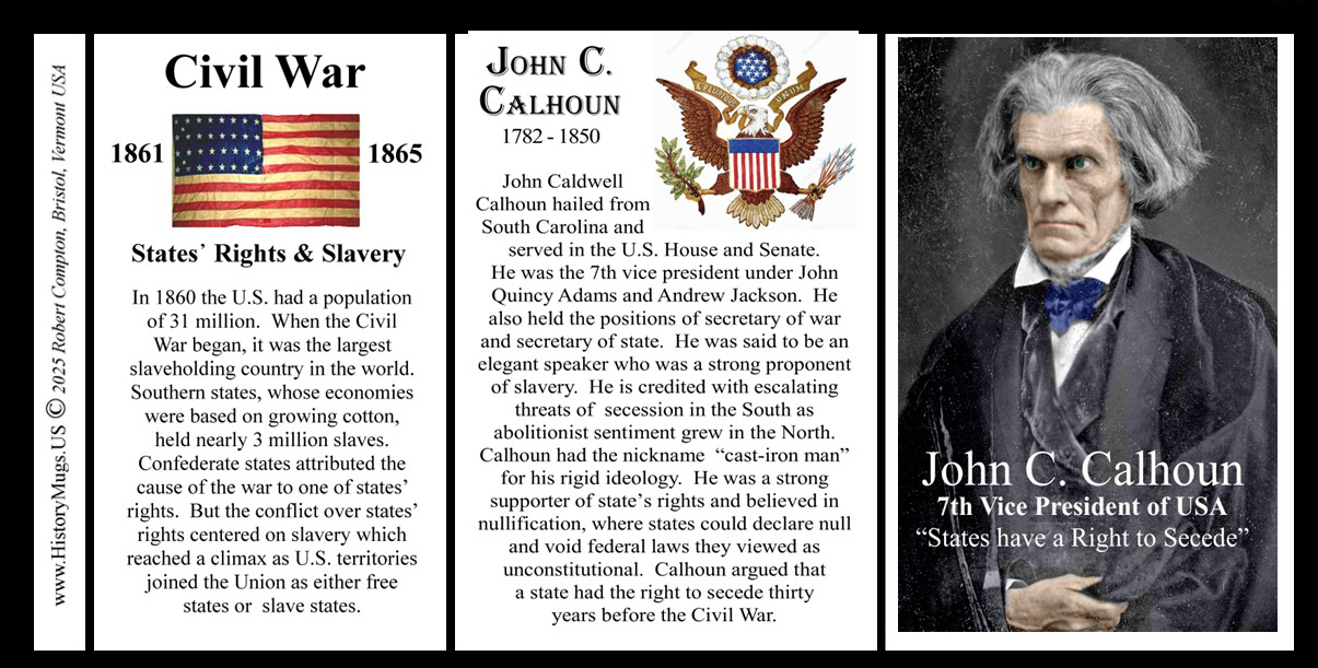 This John C. Calhoun mug is part of our Civil War Series profiling participants in the War Between the States. Thousands of Confederate and Union soldiers fought in battles such as Bull Run, Antietam, Fredericksburg, Chancellorsville, Gettysburg, Vicksburg, Chattanooga, Cold Harbor and Petersburg. We honor their sacrifices by telling their stories.