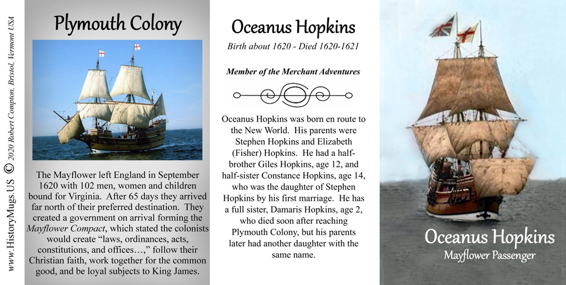 Oceanus Hopkins was born en route to the New World. His parents were Stephen Hopkins and Elizabeth (Fisher) Hopkins. He had a half-brother Giles Hopkins, age 12, and a half-sister, Constance Hopkins, age 14, who was the daughter of Stephen Hopkins by his first marriage. He has a full sister, Damaris Hopkins, age 2, who died soon after reaching Plymouth Colony, but his parents later had another daughter with the same name.