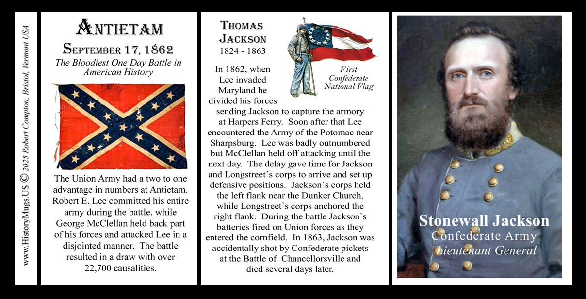 This Stonewall Jackson mug is part of our Civil War series profiling participants in the War Between the States. Thousands of Confederate and Union soldiers fought in battles such as Bull Run, Antietam, Fredericksburg, Chancellorsville, Gettysburg, Vicksburg, Chattanooga, Cold Harbor, and Petersburg. We honor their sacrifices by telling their stories.