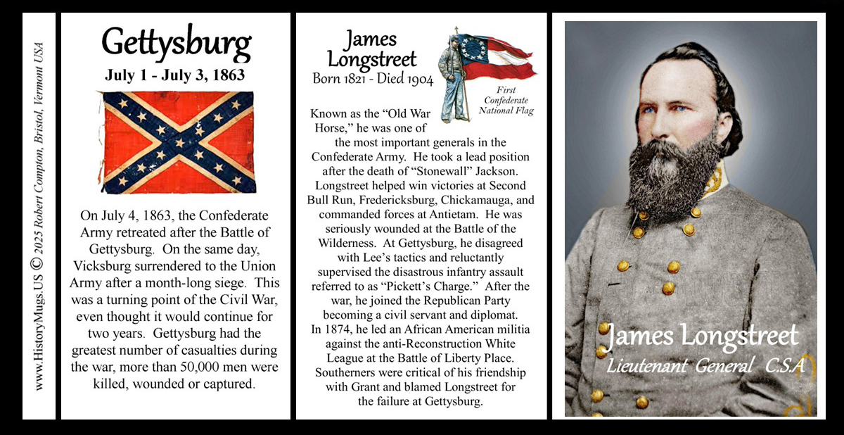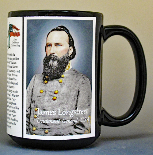 This James Longstreet mug is part of our Civil War series profiling participants in the War Between the States. Thousands of Confederate and Union soldiers fought in battles such as Bull Run, Antietam, Fredericksburg, Chancellorsville, Gettysburg, Vicksburg, Chattanooga, Cold Harbor and Petersburg. We honor their sacrifices by telling their stories.