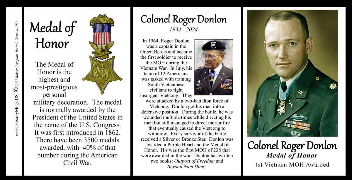 In 1964, Roger Donlon was a captain in the Green Berets and became the first soldier to receive the MOH during the Vietnam War. In July, his team of 12 Americans was tasked with training South Vietnamese civilians to fight insurgent Vietcong. They were attacked by a two-battalion force of Vietcong. Donlon got his men into a defensive position. During the battle, he was wounded multiple times while directing his men, but still managed to direct mortar fire that eventually caused the Vietcong to withdraw. Every survivor of the battle received a Silver or Bronze Star. Roger Donlon was awarded a Purple Heart and the Medal of Honor. His was the first MOH of 238 that were awarded in the war. Donlon has written two books: Outpost of Freedom and Beyond Nam Dong.