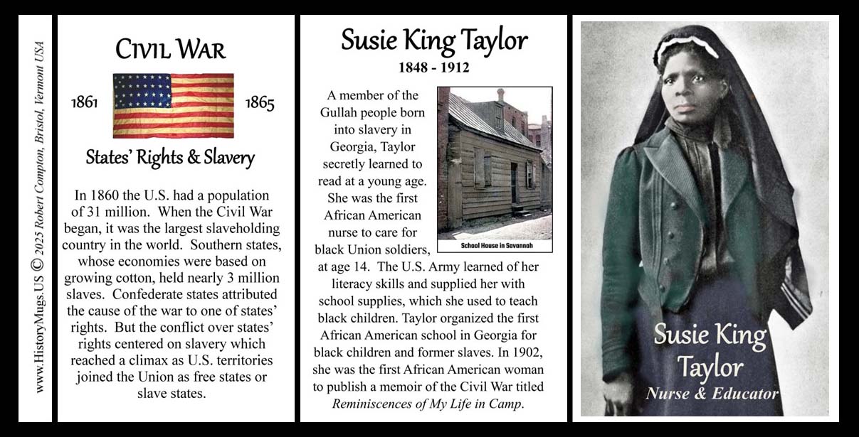 This Susie King Taylor mug is part of our Civil War, Abolitionist, and African American Series profiling outstanding men and women who have helped shape our country in important and positive ways.